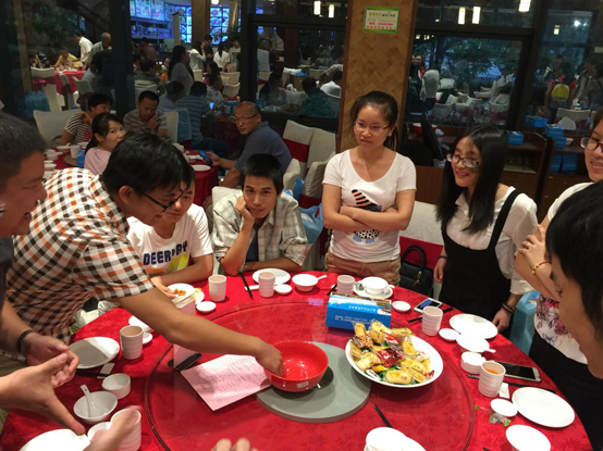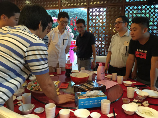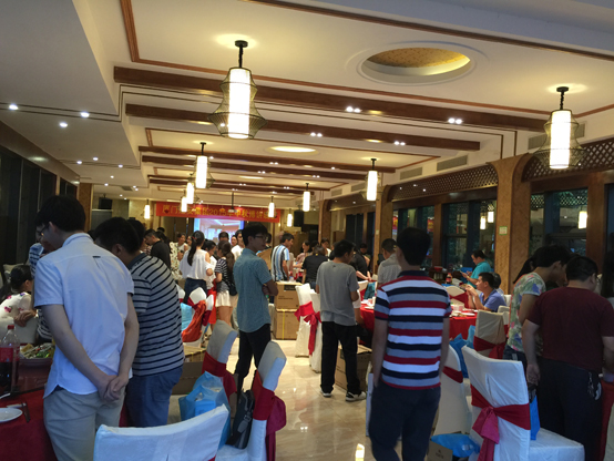 當晚,伴著主持人曾怡航“開博”的一擊銅鑼聲,十三個博餅瓷碗里的骰子同時響起。第一輪博餅開始,全場骰子聲叮叮當當,一秀、二舉、四進、三紅、對堂、狀元相繼出桌,現(xiàn)場的氣氛一次次推向高潮,整個會場成了一片歡樂的海洋,桌上的禮品也悉數(shù)被員工收入囊中。經(jīng)過第一輪激烈初賽產(chǎn)生的13名桌狀元參與到第二輪的“狀元王中王”爭奪賽,爭奪最后的大獎,經(jīng)過激烈的角逐,王中王由來自四川的一位嘉賓幸運地博到。臺下圍觀的員工們歡聲笑語,共享美酒佳肴,其樂融融。