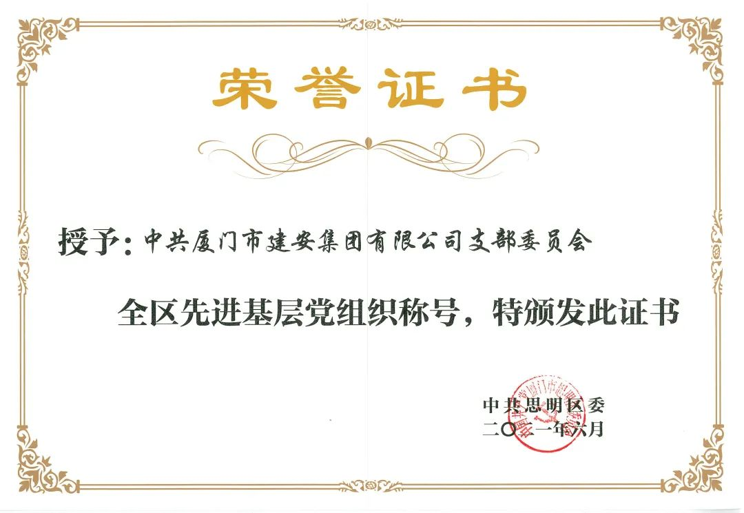 在熱烈慶祝中國共產(chǎn)黨成立100周年之際,思明區(qū)隆重召開“兩優(yōu)一先”表彰大會,一批在思明各領(lǐng)域的優(yōu)秀共產(chǎn)黨員、優(yōu)秀黨務(wù)工作者、先進(jìn)基層黨組織受到表彰。廈門市建安集團(tuán)有限公司黨支部獲頒“思明區(qū)先進(jìn)基層黨組織”稱號。